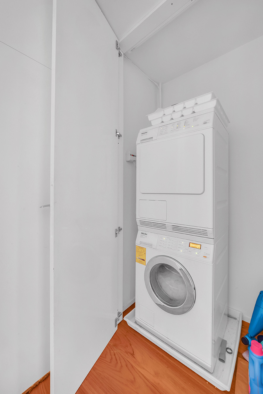 The expansive primary bedroom is a serene retreat, featuring a wall of windows, a queen-size bed, and custom closets with space for a cozy sitting area. Its marble-clad en-suite bathroom is appointed with a Duravit Jacuzzi tub, a separate shower, and a bidet. The second bedroom offers custom built-in pull-out twin beds and its own en-suite bath, thoughtfully designed to double as a sun-filled home office. A pocket door between the living room and primary bedroom lends an open, airy flow throughout. The kitchen is equipped with premium appliances, including a Bertazzoni range and Miele dishwasher, with ample storage to match. An additional powder room completes the residence.