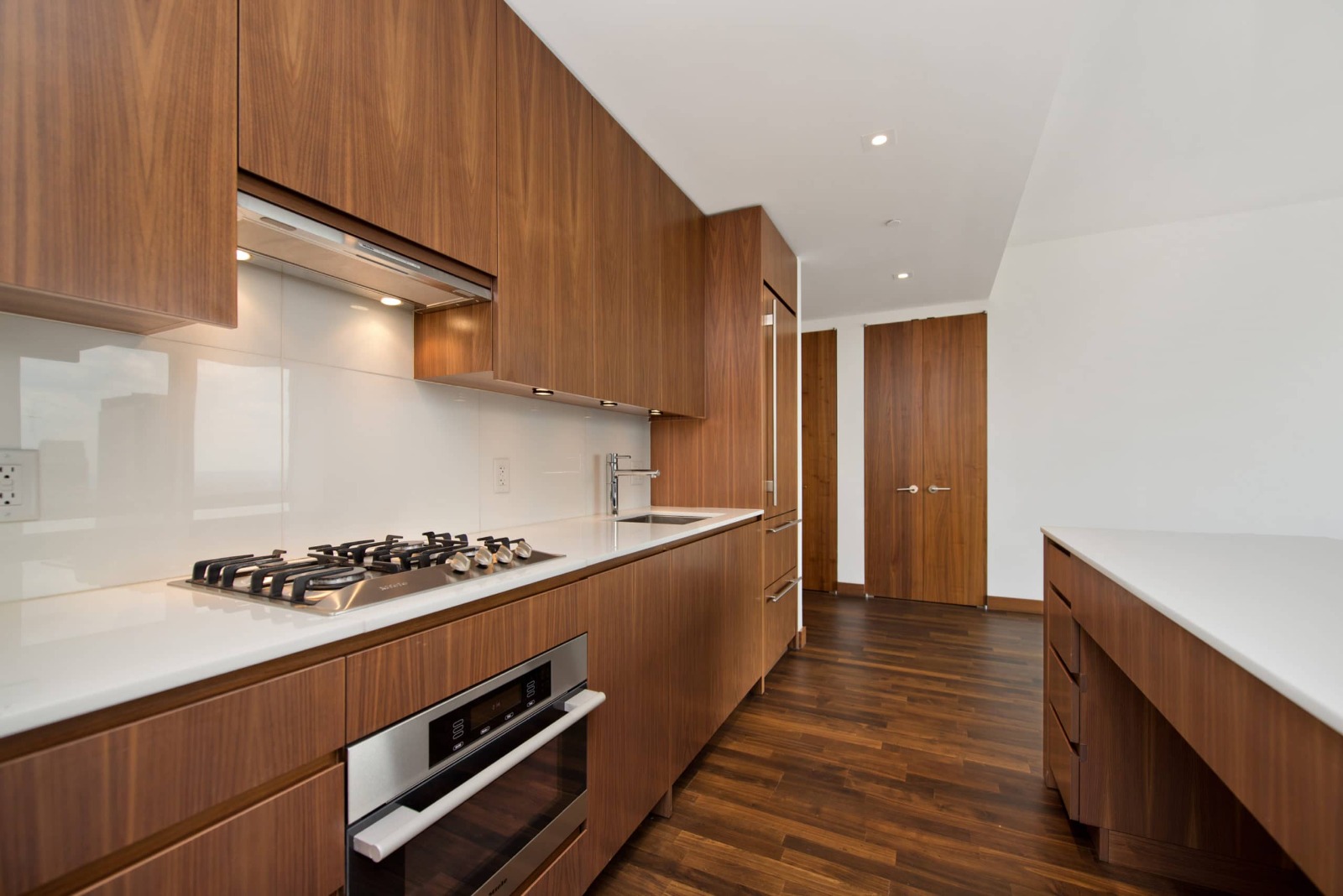The apartment is finished with oak floors with matching solid wood doors. The kitchen is appointed with Poliform cabinetry, Mont Blanc stone tops, and Miele and Subzero appliances. A Miele washer/dryer is elegantly concealed behind a separate door.