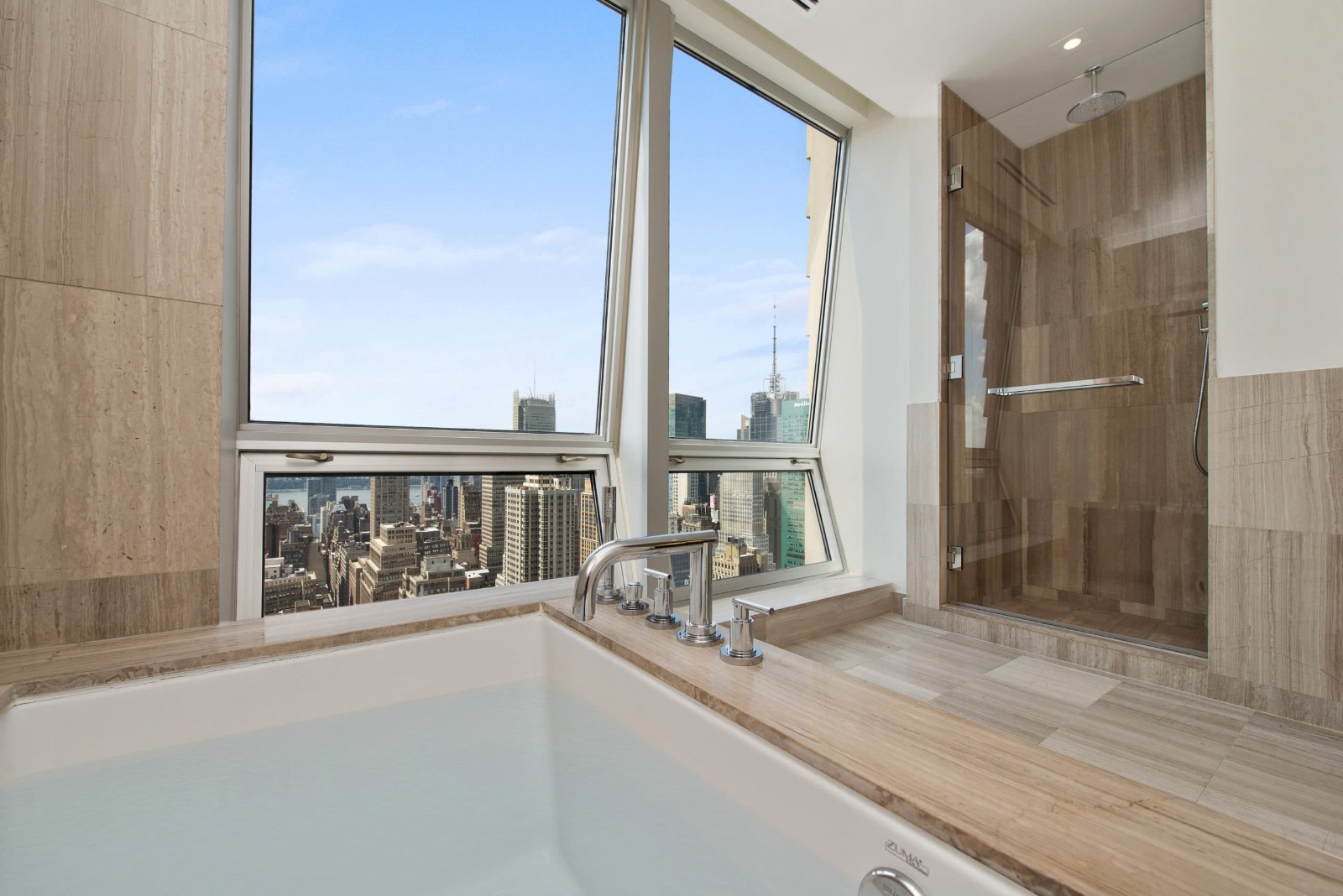 Among the highlights of the master bathroom are the two oversized west-facing windows, double vanities, a soaking tub, a separate shower stall, Grohe fixtures, and Haisa marble flooring and walls. A powder room by the entrance completes the list of comforts offered by this apartment.