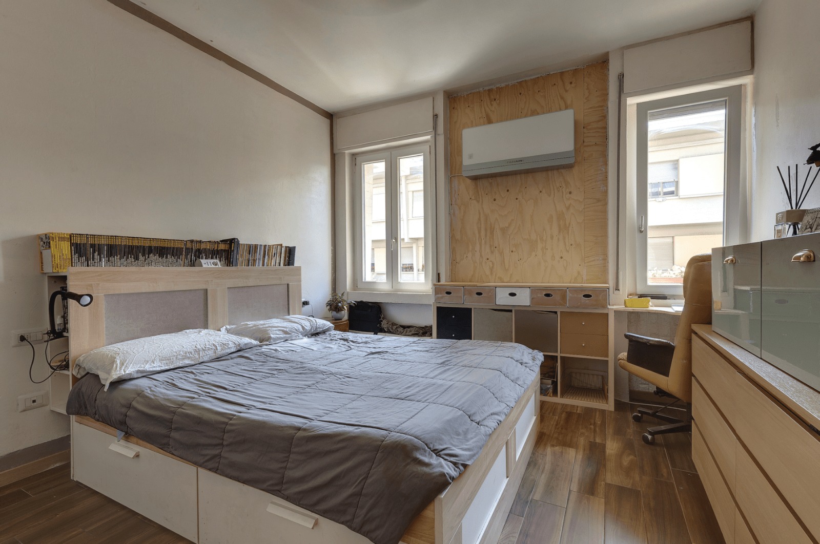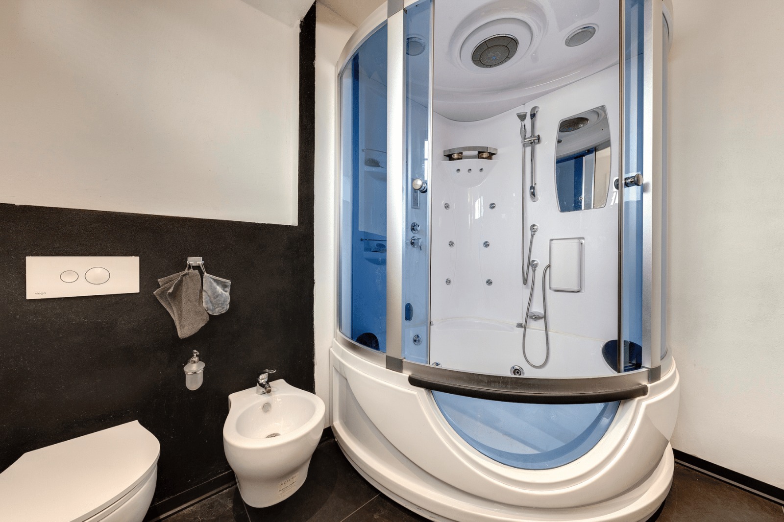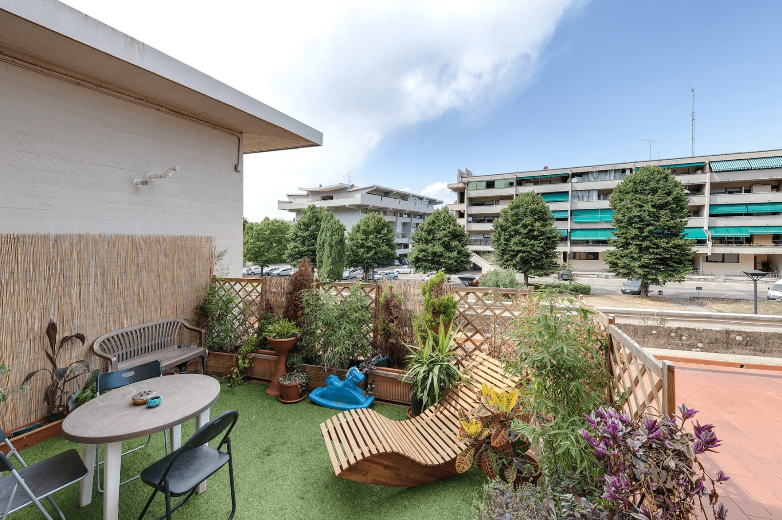 L’immobile è composto da ampio open-space con cucina abitabile e soggiorno, due camere matrimoniali, una cameretta – studio, due ripostigli, due bagni di cui uno con vasca idromassaggio, completa la proprietà una terrazza abitabile condominiale ma di pertinenza all’appartamento, un posto auto ed un posto moto.