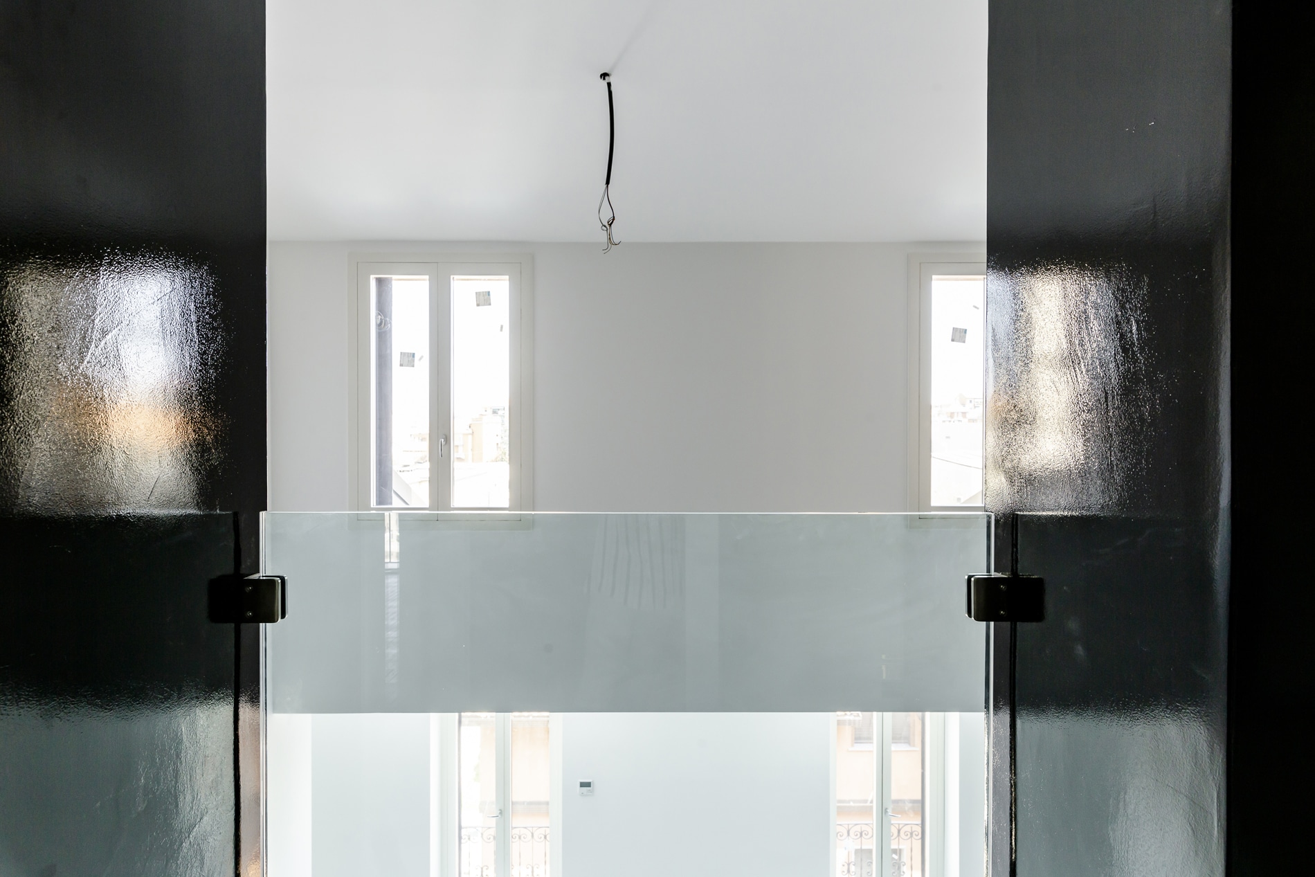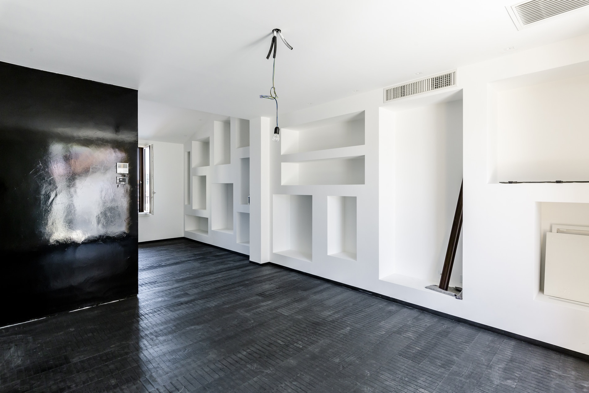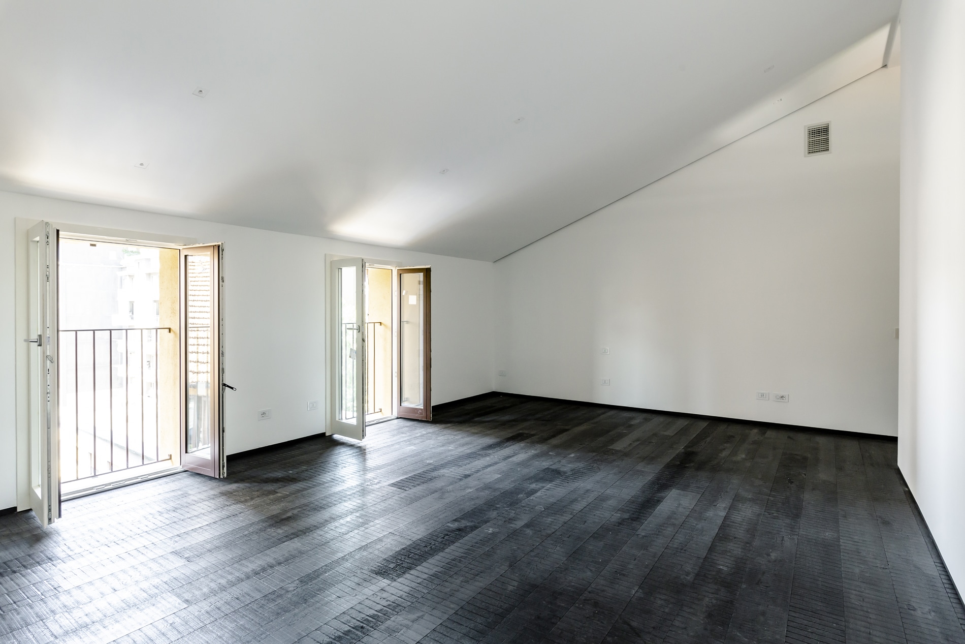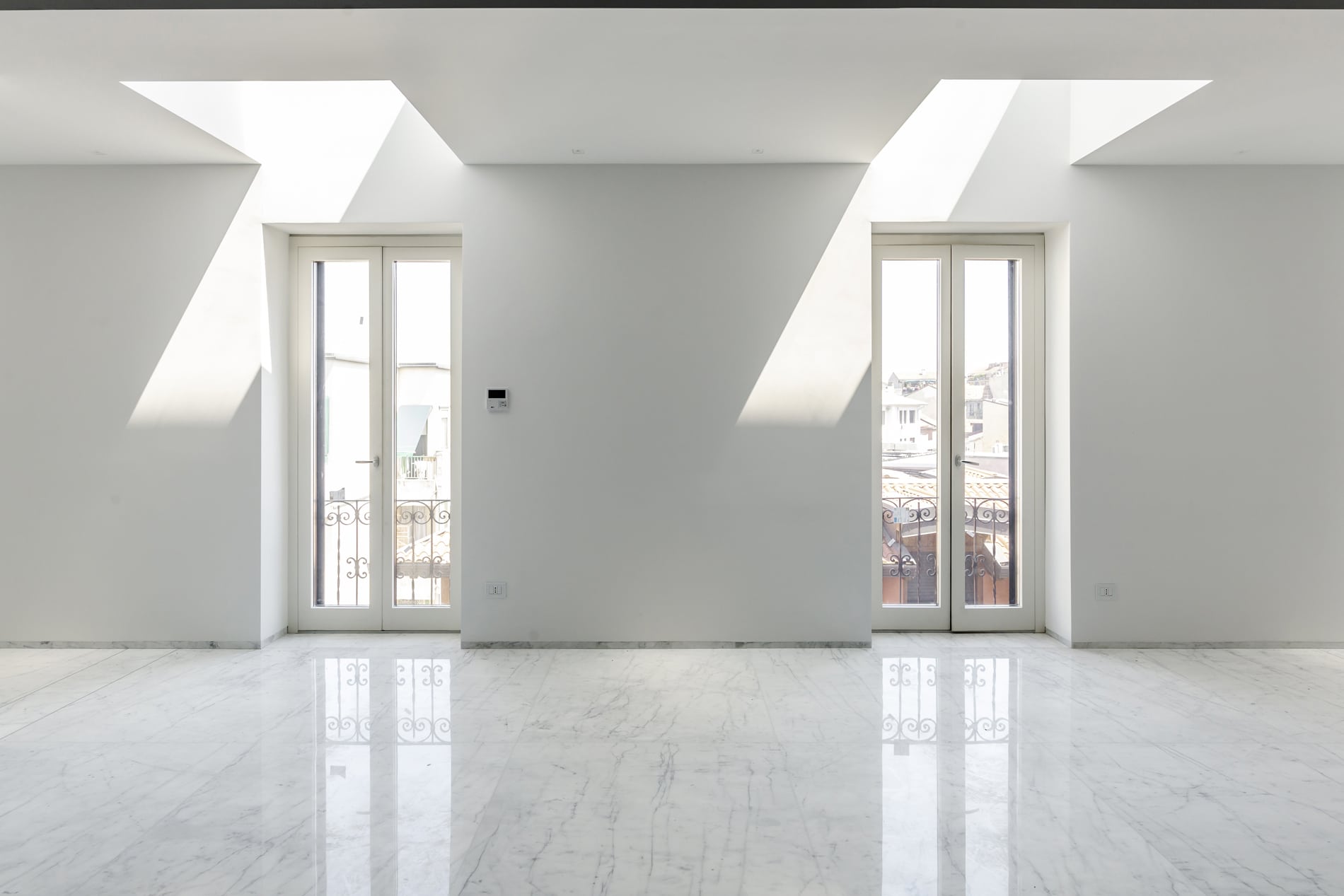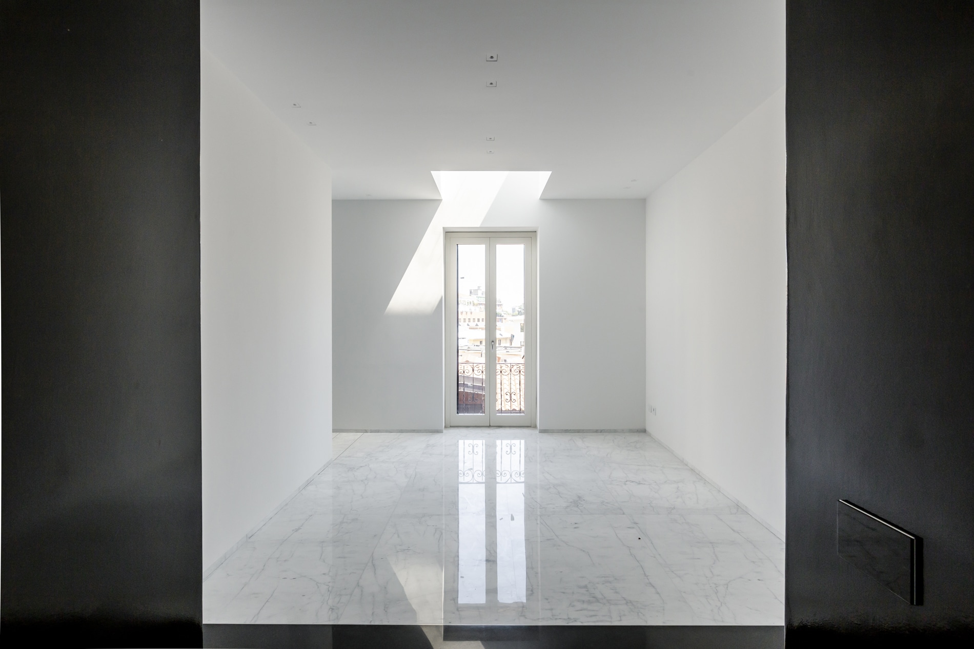 On the floor, an eat-in kitchen as well as the sleeping area consisting of a bedroom with en-suite bathroom and walk-in closet, as well as the service bathroom. An elegant design staircase leads to the upper floor where a balcony overlooking the living room leads on, one side, to the master bedroom with double bathroom and, on the other, to the library/study area. The external areas include the terrace on the fourth floor which leads to the upper terrace-belvedere where it’s possible to create a hanging garden. The apartment has a double exposure to the north-east and south-west.