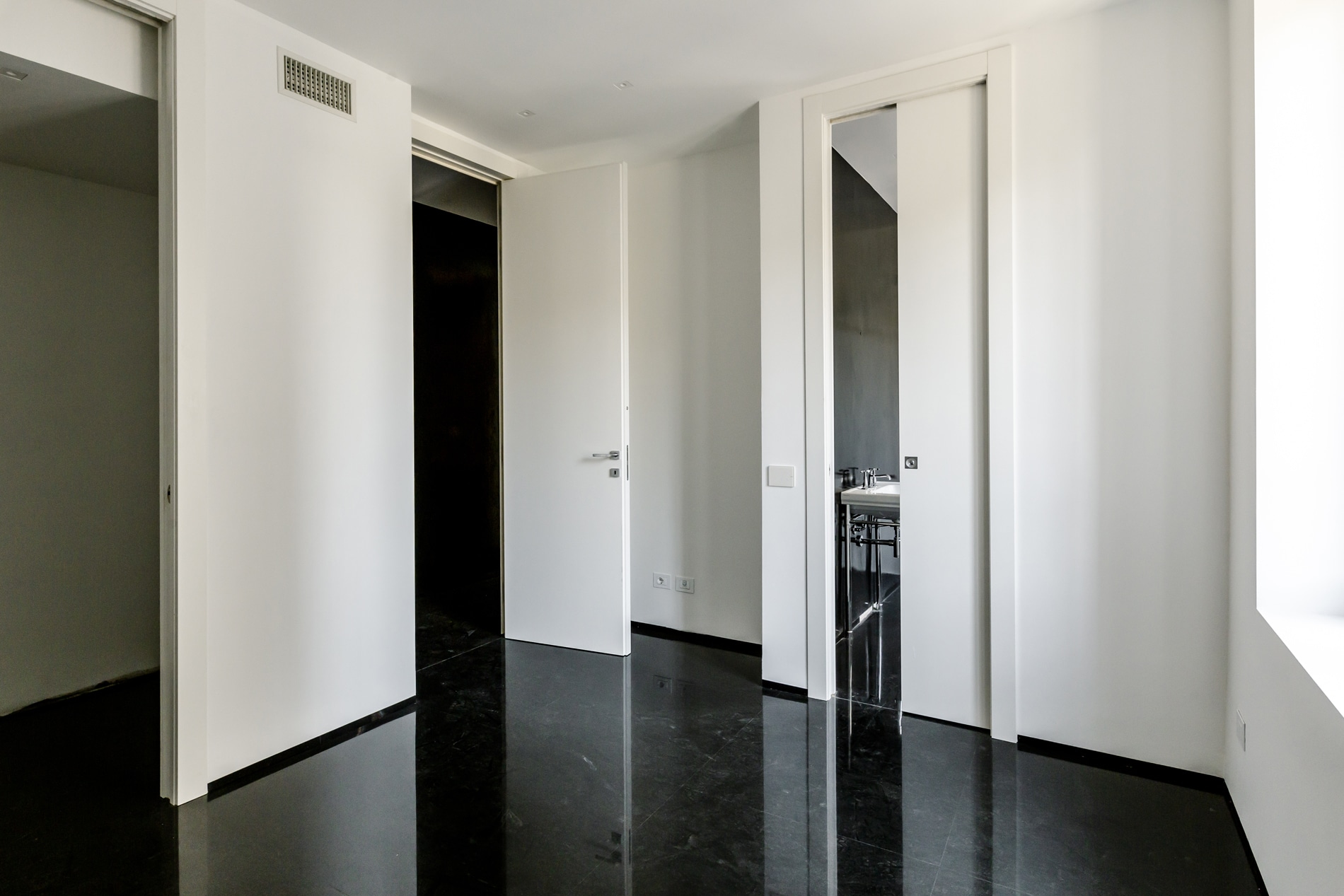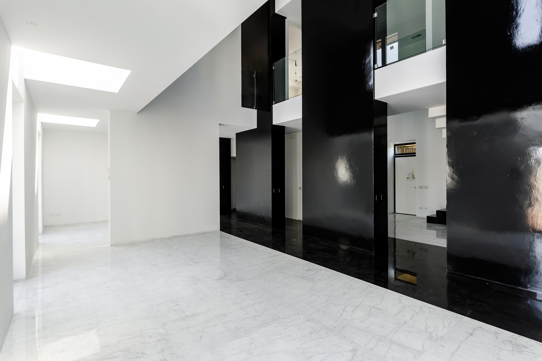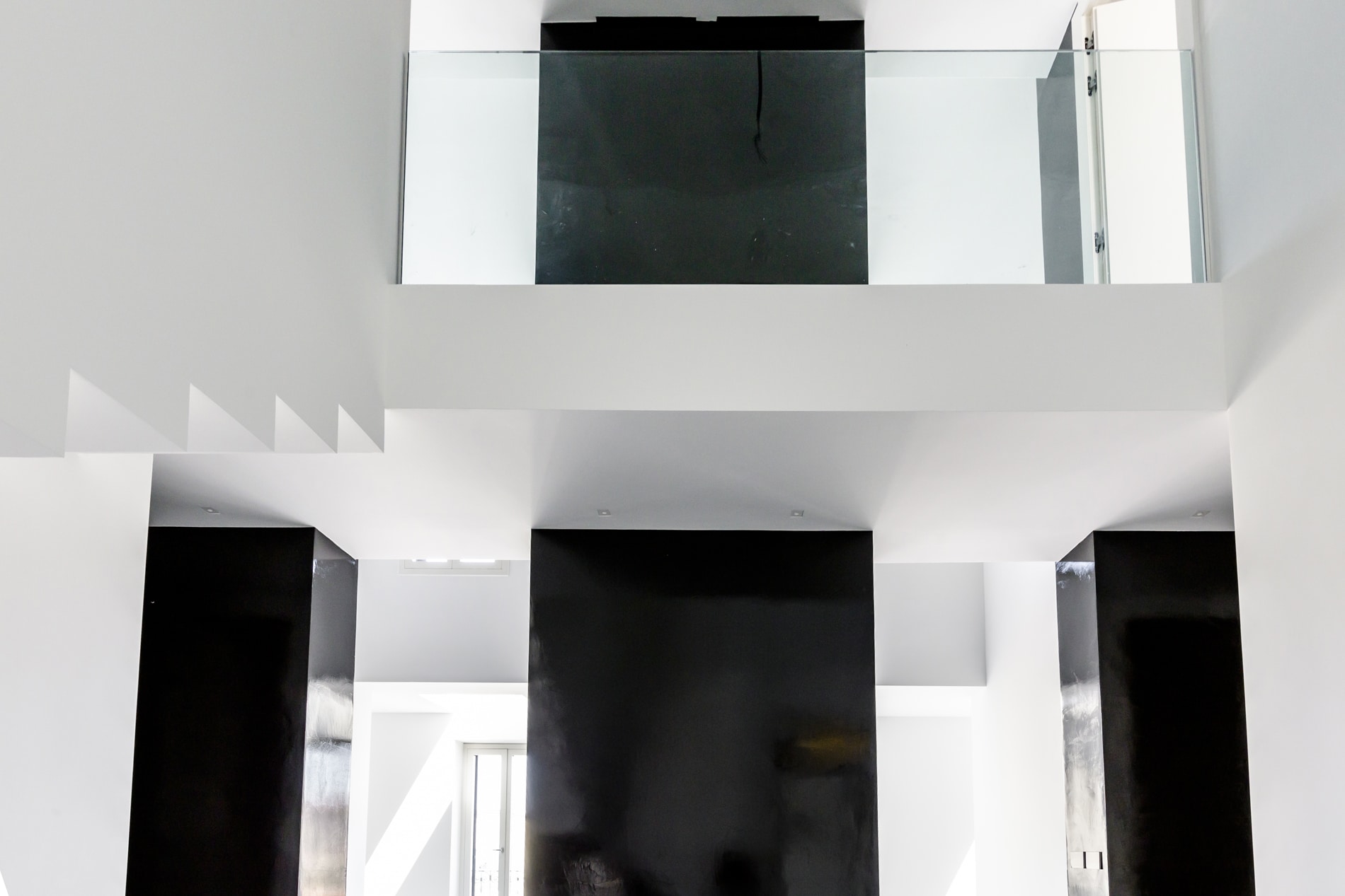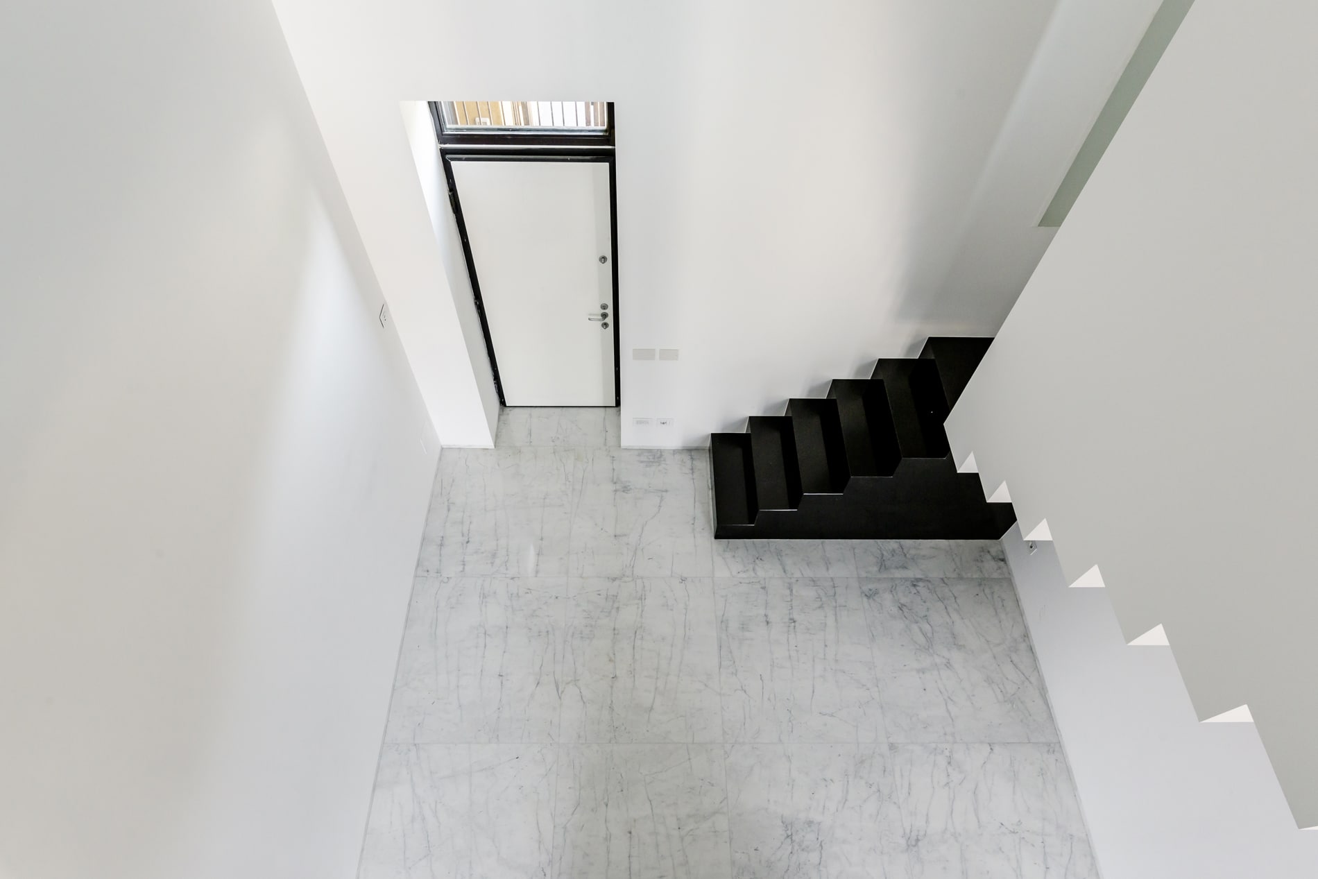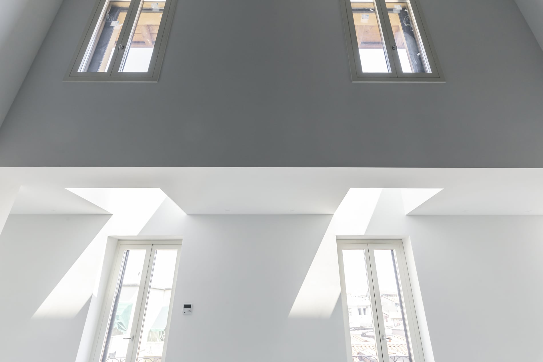 On the floor, an eat-in kitchen as well as the sleeping area consisting of a bedroom with en-suite bathroom and walk-in closet, as well as the service bathroom. An elegant design staircase leads to the upper floor where a balcony overlooking the living room leads on, one side, to the master bedroom with double bathroom and, on the other, to the library/study area. The external areas include the terrace on the fourth floor which leads to the upper terrace-belvedere where it’s possible to create a hanging garden. The apartment has a double exposure to the north-east and south-west.