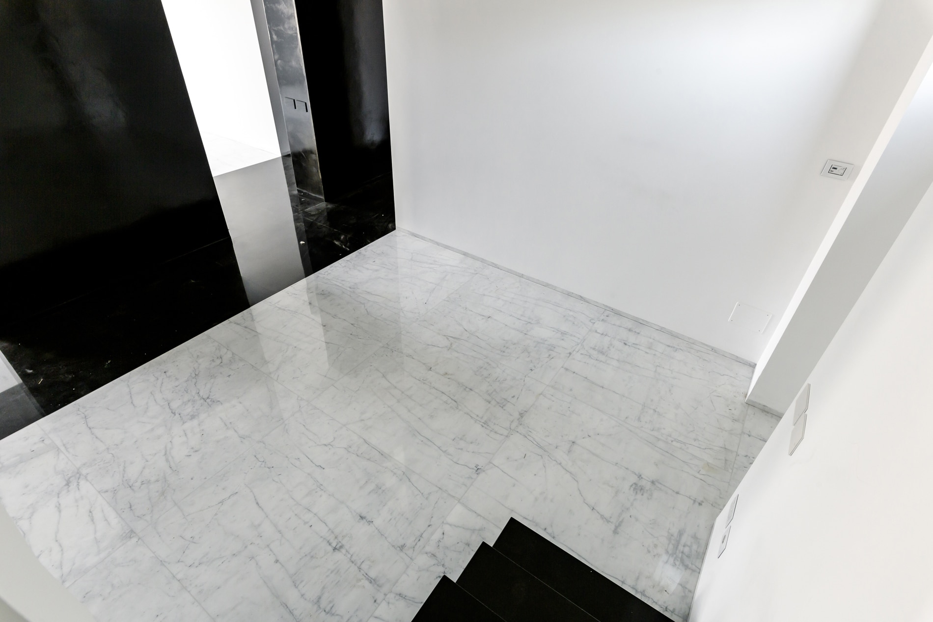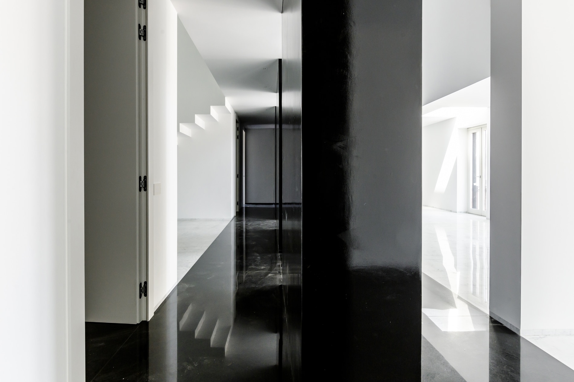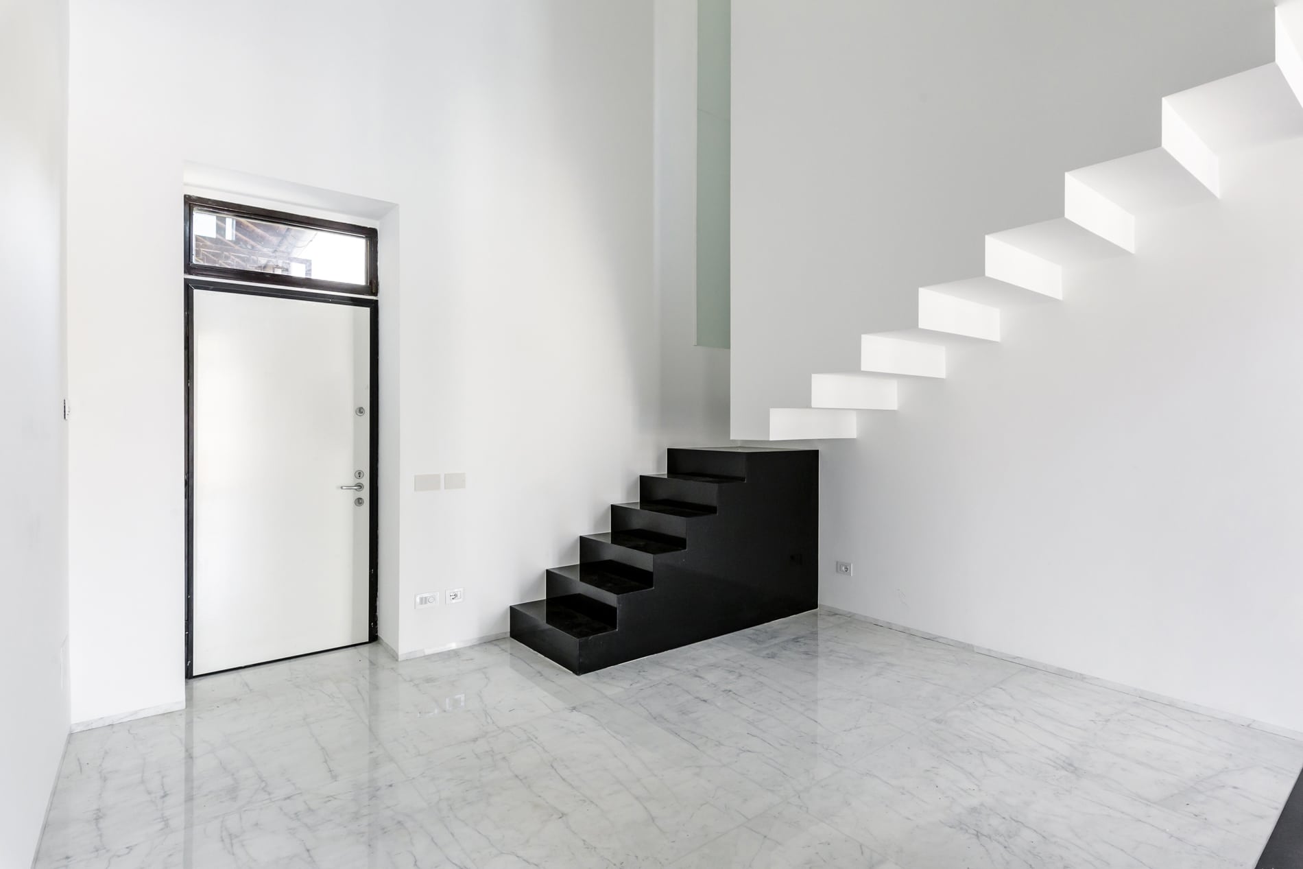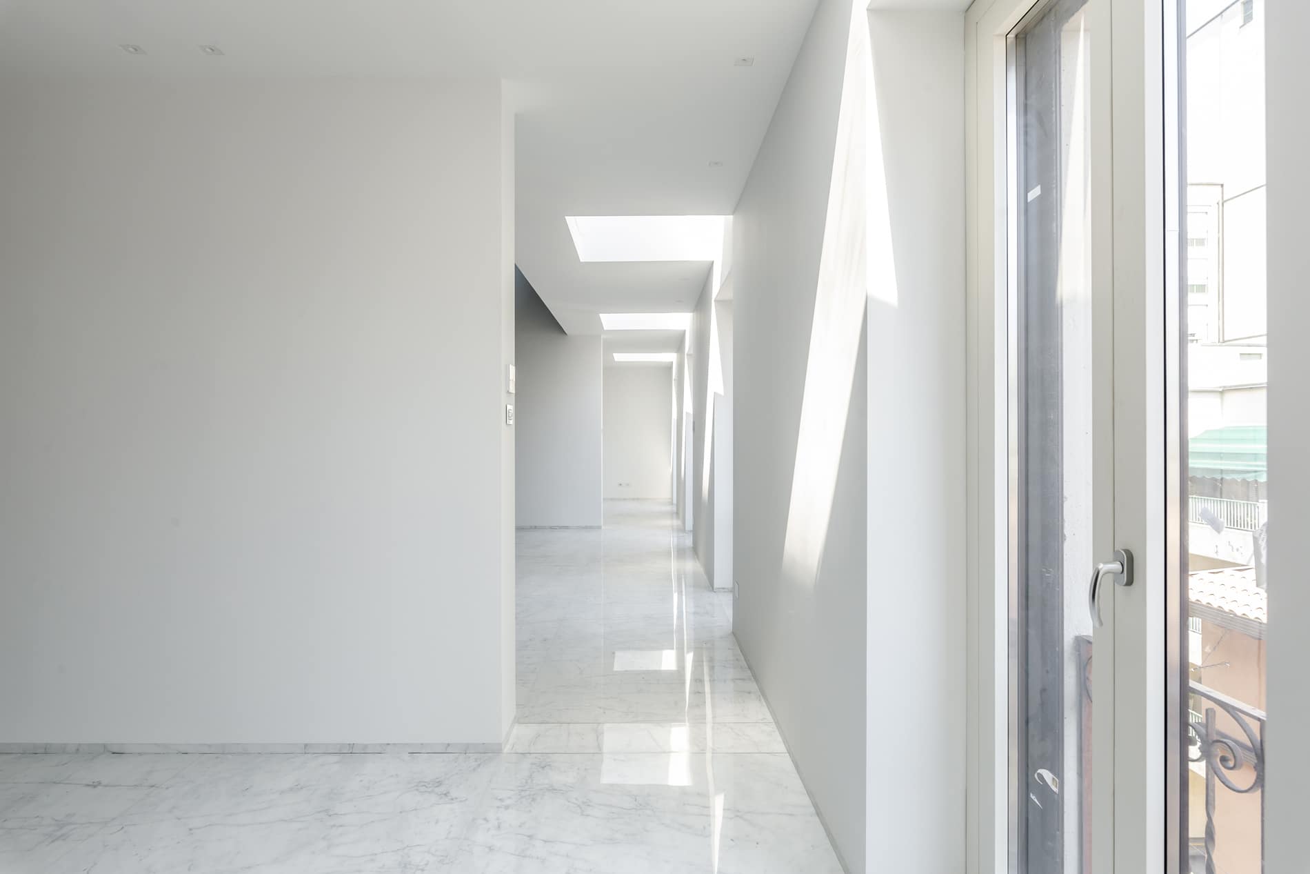 On the floor, an eat-in kitchen as well as the sleeping area consisting of a bedroom with en-suite bathroom and walk-in closet, as well as the service bathroom. An elegant design staircase leads to the upper floor where a balcony overlooking the living room leads on, one side, to the master bedroom with double bathroom and, on the other, to the library/study area. The external areas include the terrace on the fourth floor which leads to the upper terrace-belvedere where it’s possible to create a hanging garden. The apartment has a double exposure to the north-east and south-west.