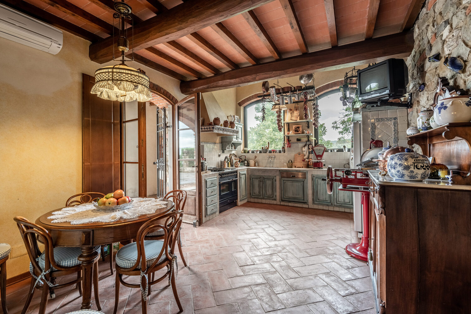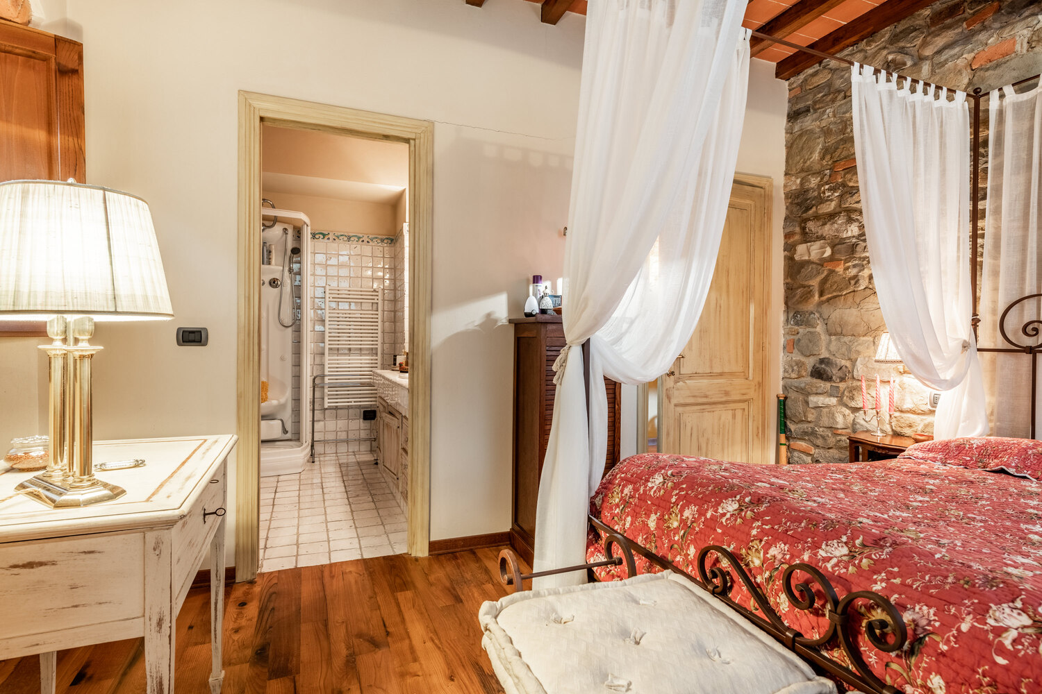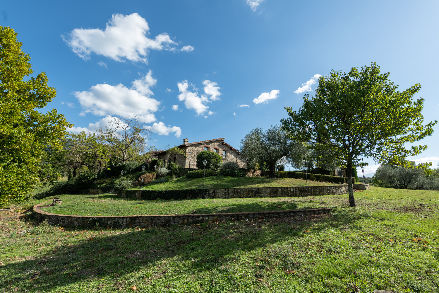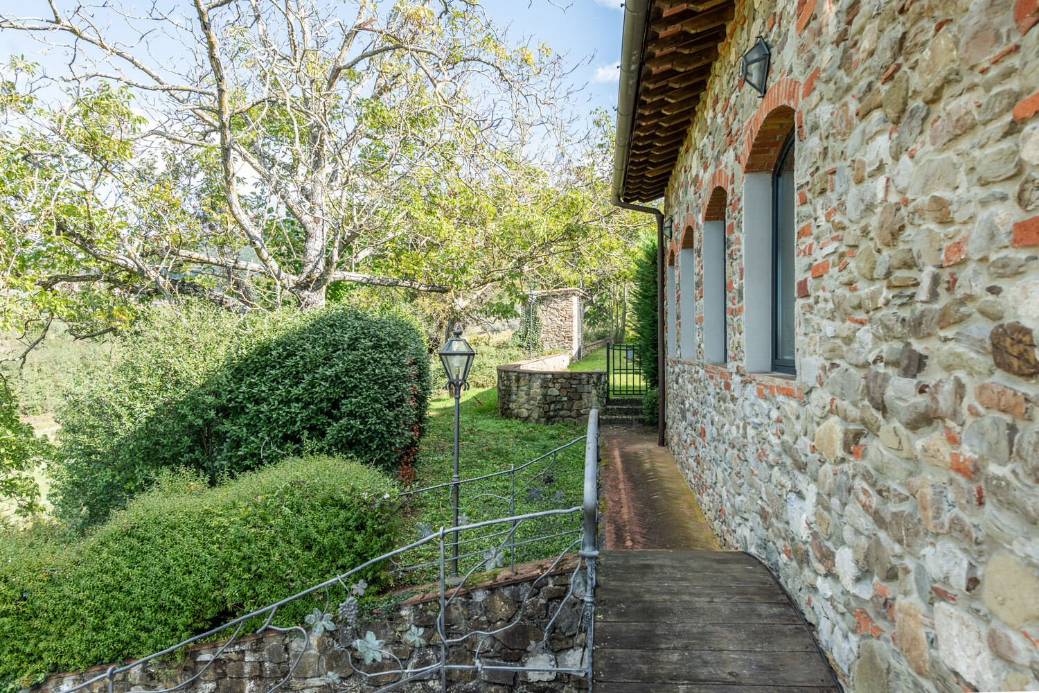 L’abitazione si completa con un loggiato, un ampio piazzale in pietra ed un bellissimo giardino. La casa colonica è stata completamente ristrutturata e sono state create cinque unità abitative: tre situate al piano terra con una, due e tre camere, relativi soggiorni, cucine e bagni ed infine due unità abitative al primo piano, con due e tre camere, due bagni ciascuna e relative cucine e soggiorni.