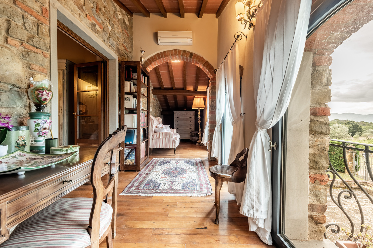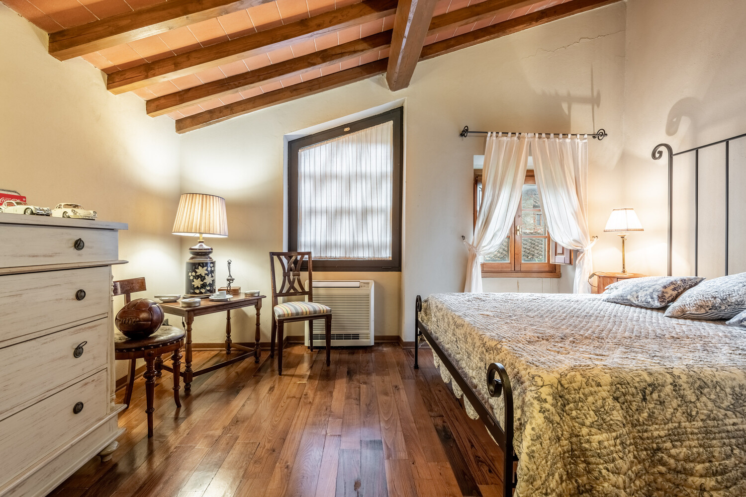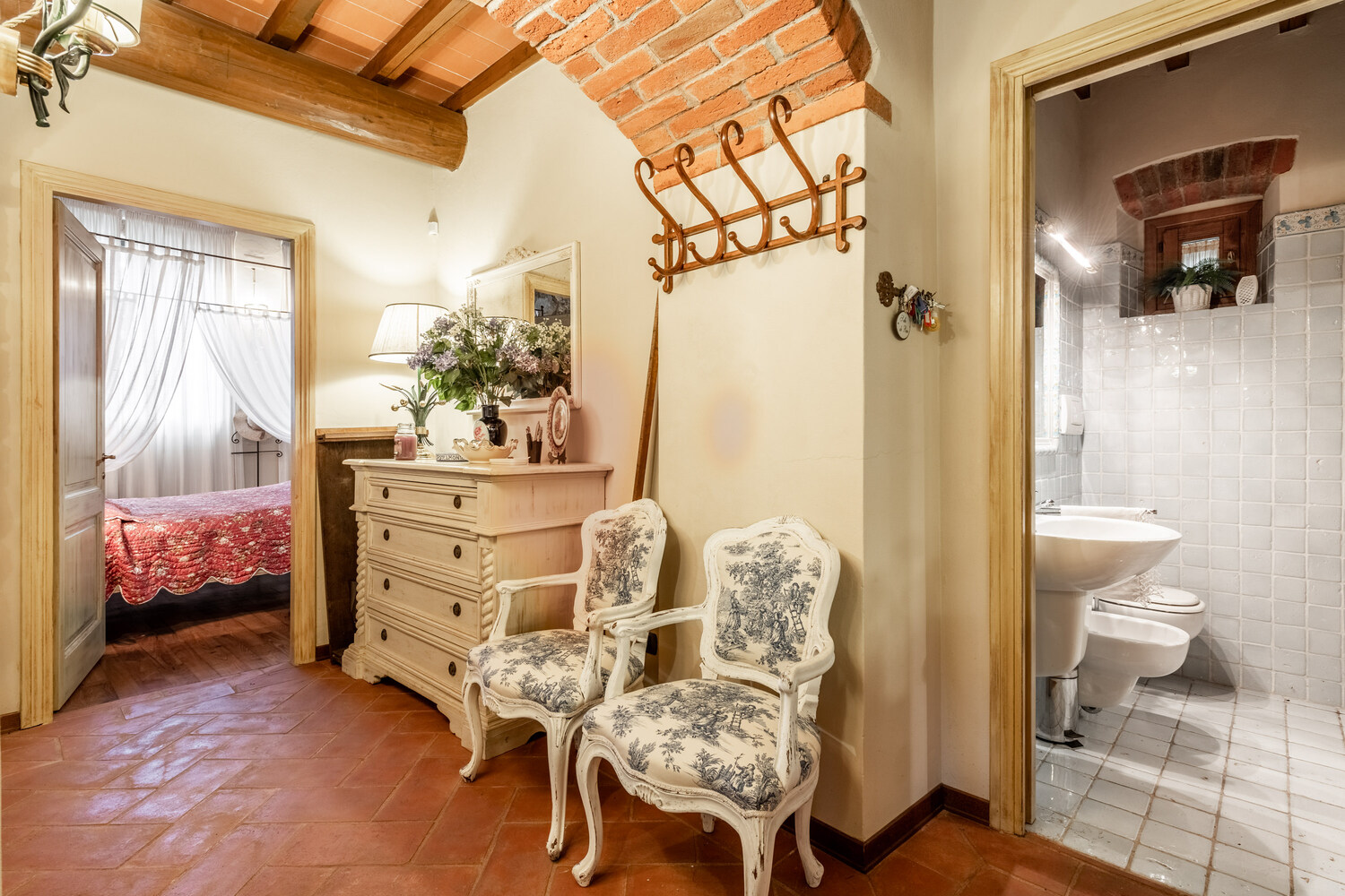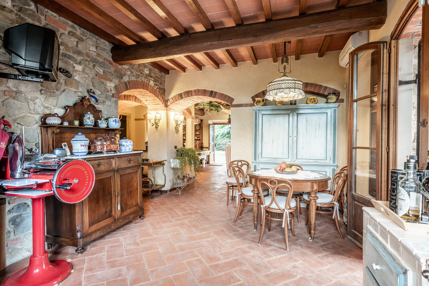 L’abitazione si completa con un loggiato, un ampio piazzale in pietra ed un bellissimo giardino. La casa colonica è stata completamente ristrutturata e sono state create cinque unità abitative: tre situate al piano terra con una, due e tre camere, relativi soggiorni, cucine e bagni ed infine due unità abitative al primo piano, con due e tre camere, due bagni ciascuna e relative cucine e soggiorni.